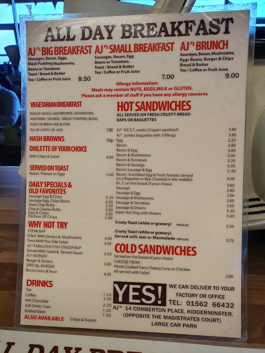 Welcome to AJ's Diner, a charming eatery located at 14 Comberton Pl, Kidderminster, where hearty meals meet a cozy atmosphere. Here, breakfast lovers can indulge in an all-day breakfast that promises generous portions and delightful flavors, all at great value.